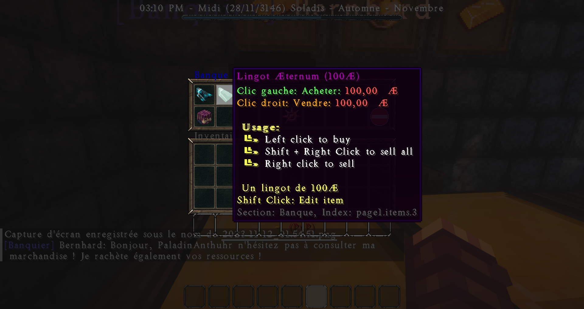 Enfin, un PNJ Banquier de n'importe quel Royaume permettre de convertir votre Æternum immatériel en monnaie physique afin de mettre à l'abri votre argent d'une perte de 3% en cas de mort ou pour dépasser la limitte fixée à 10 000 Æternum.